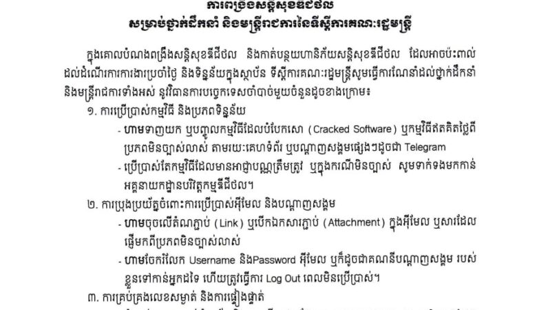 សេចក្តីណែនាំស្ដីពីការពង្រឹងសន្តិសុខឌីជីថល សម្រាប់ថ្នាក់ដឹកនាំ និងមន្រ្តីរាជការនៃទីស្ដីការគណៈរដ្ឋមន្រ្តី