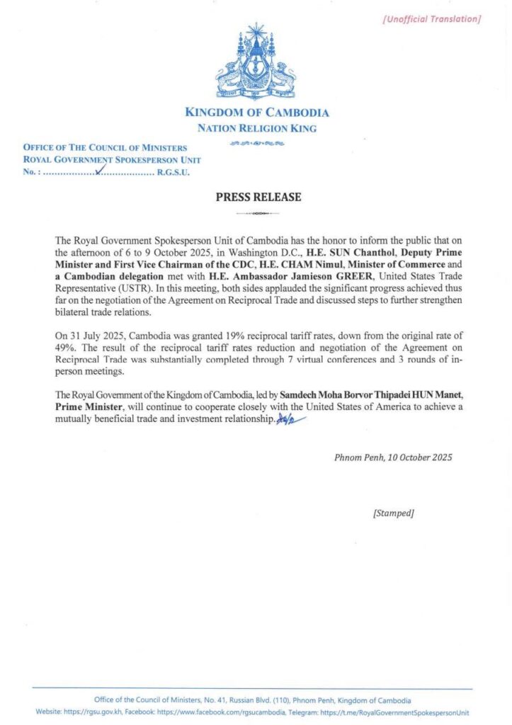 PRESS RELEASE The Cambodia Government Spokesperson Unit: Cambodia-USA applauded the significant progress achieved thus far on the negotiation of the Agreement on Reciprocal Trade and discussed steps to further strengthen bilateral trade relations.