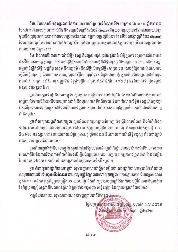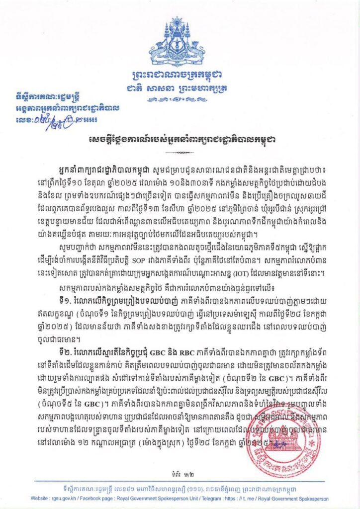 សេចក្តីថ្លែងការណ៍ពិសេសរបស់អ្នកនាំពាក្យរាជរដ្ឋាភិបាល ស្តីពី សកម្មភាពឈ្លានពានរបស់ថៃនៅភូមិព្រៃចាន់ ឃុំអូរបីជាន់ ស្រុកអូរជ្រៅ ខេត្តបន្ទាយមានជ័យ ថ្ងៃទី១០ ខែតុលា ឆ្នាំ២០២៥។