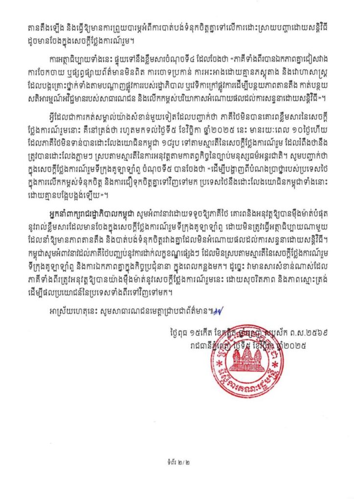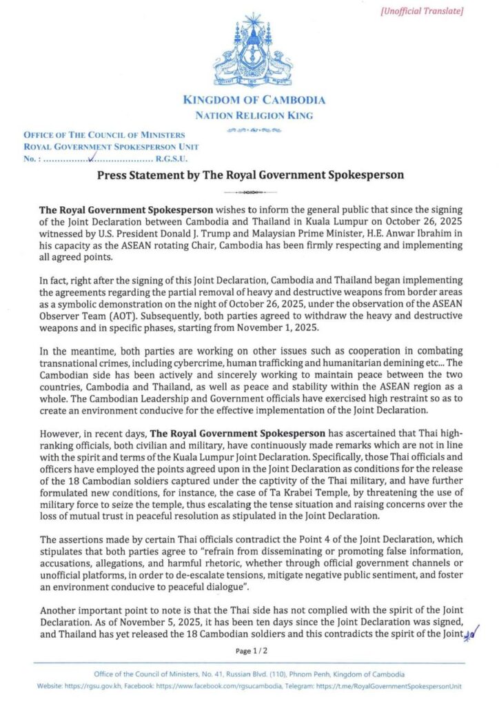 The Spokesperson of the Royal Government of Cambodia reaffirmed Cambodia’s steadfast commitment to the full implementation of the Joint Statement on the Kuala Lumpur Peace Agreement and called upon the Thai side to fully respect and adhere to the same.