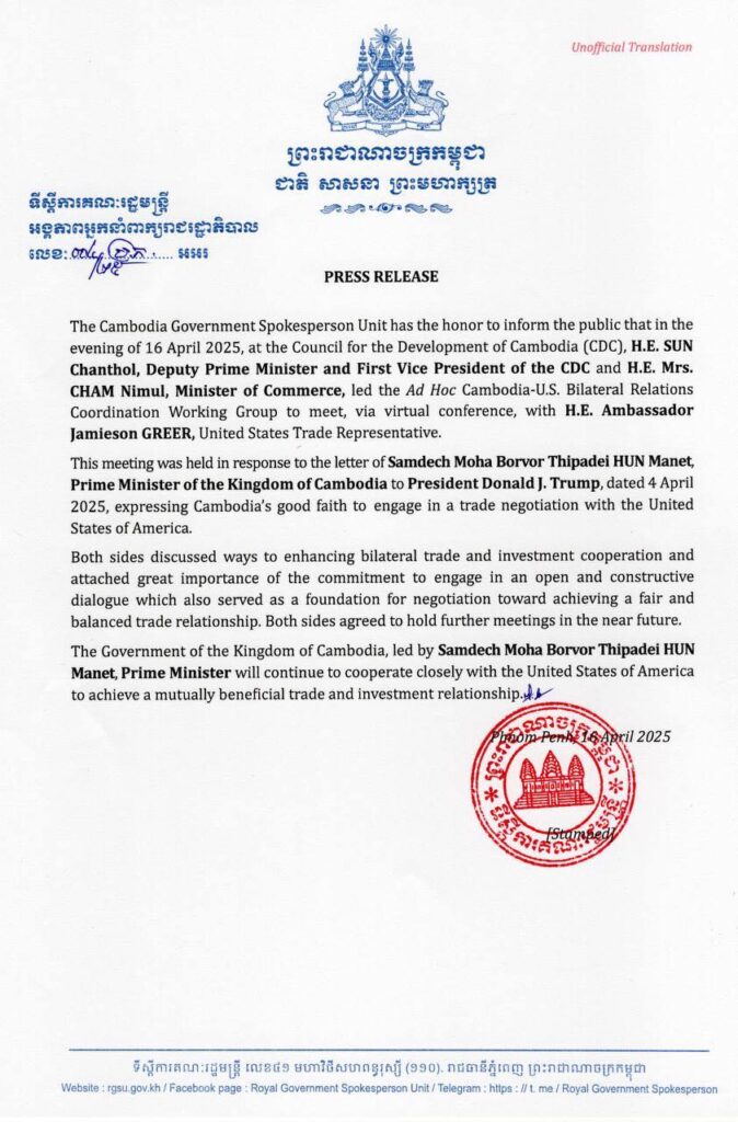 សេចក្តីប្រកាសព័ត៌មានរបស់អង្គភាពអ្នកនាំពាក្យរាជរដ្ឋាភិបាលកម្ពុជា ជុំវិញការជួបប្រជុំទ្វេភាគីតាមប្រព័ន្ធវីដេអូ ជាមួយ ឯកឧត្តមឯកអគ្គរដ្ឋទូត Jamieson Greer ប្រធានតំណាងពាណិជ្ជកម្មសហរដ្ឋអាម៉េរិក។