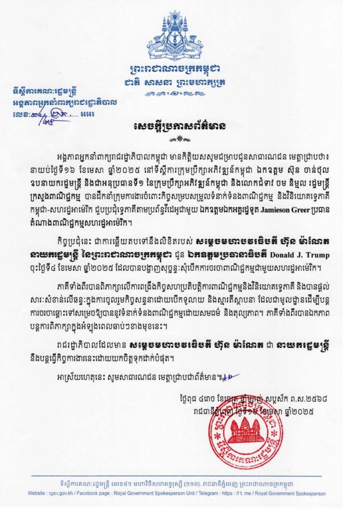 សេចក្តីប្រកាសព័ត៌មានរបស់អង្គភាពអ្នកនាំពាក្យរាជរដ្ឋាភិបាលកម្ពុជា ជុំវិញការជួបប្រជុំទ្វេភាគីតាមប្រព័ន្ធវីដេអូ ជាមួយ ឯកឧត្តមឯកអគ្គរដ្ឋទូត Jamieson Greer ប្រធានតំណាងពាណិជ្ជកម្មសហរដ្ឋអាម៉េរិក។