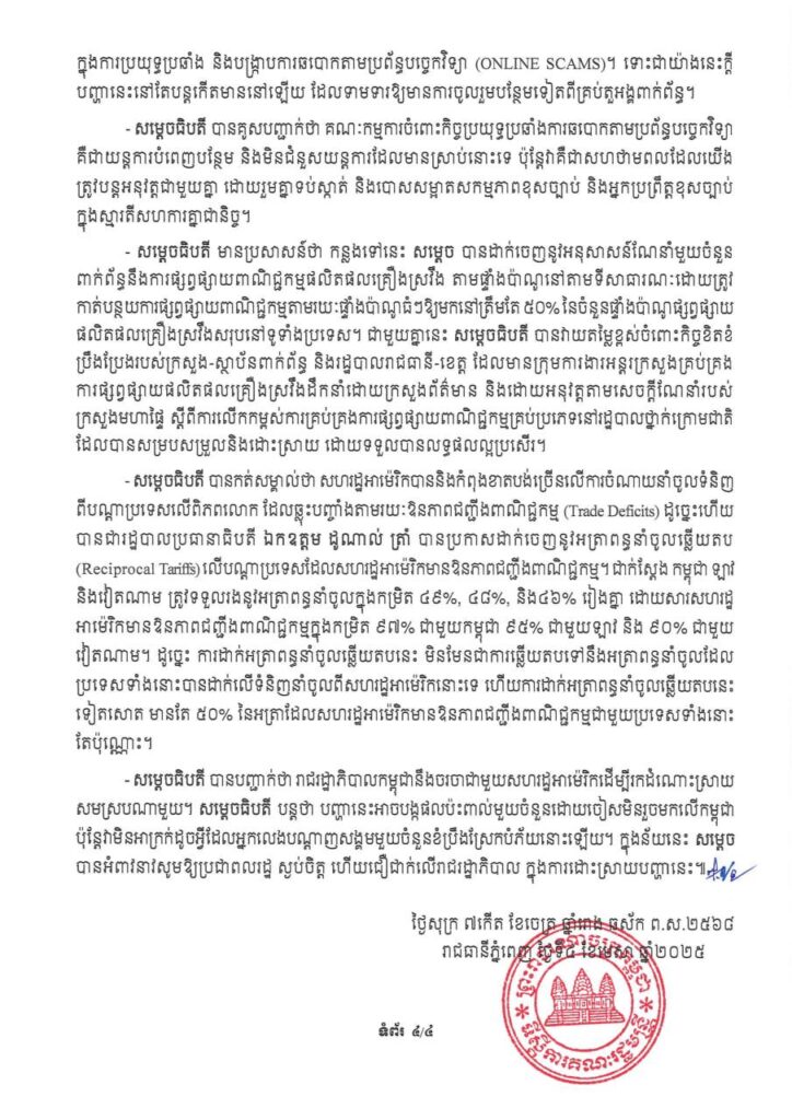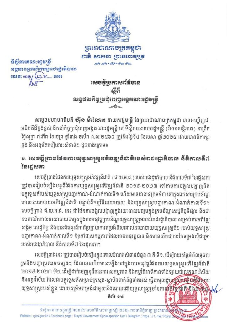 សម្តេចមហាបវរធិបតី ហ៊ុន ម៉ាណែត នាយករដ្ឋមន្ត្រី នៃព្រះរាជាណាចក្រកម្ពុជា បានអញ្ជើញជាអធិបតីដ៏ខ្ពង់ខ្ពស់ ដឹកនាំកិច្ចប្រជុំពេញអង្គគណៈរដ្ឋមន្ត្រី នៅទីស្ដីការនាយករដ្ឋមន្រ្តី (វិមានសន្តិភាព) នាព្រឹកថ្ងៃសុក្រ ៧កើត ខែចេត្រ ឆ្នាំរោង ឆស័ក ព.ស.២៥៦៨ ត្រូវនឹងថ្ងៃទី៤ ខែមេសា ឆ្នាំ២០២៥ ដោយបានពិភាក្សា ឆ្លង និងអនុម័តរបៀបវារៈសំខាន់ៗរួមមាន៖